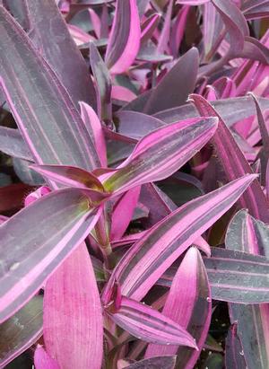 Brilliant purple and white striped, lance-shaped foliage holds its color all summer. Small, starry mauve flowers. Spreading/trailing habit.
